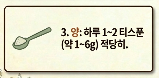 - 성인 기준: 하루 1~6g (티스푼으로 1~2스푼 정도)