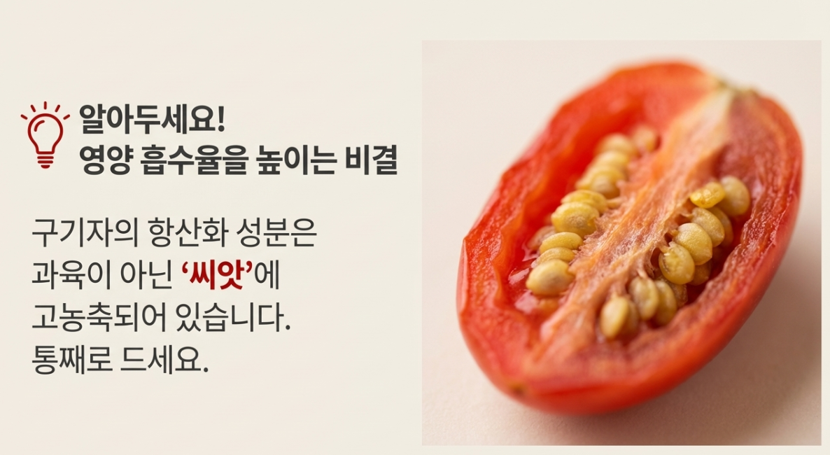 구기자의 항산화 성분은 과육뿐만 아니라 '씨앗'에 고농축되어 있어요. 차로 끓이거나 드실 때 씨앗까지 통째로 섭취하는 것이 영양 흡수율을 높이는 비결이랍니다!