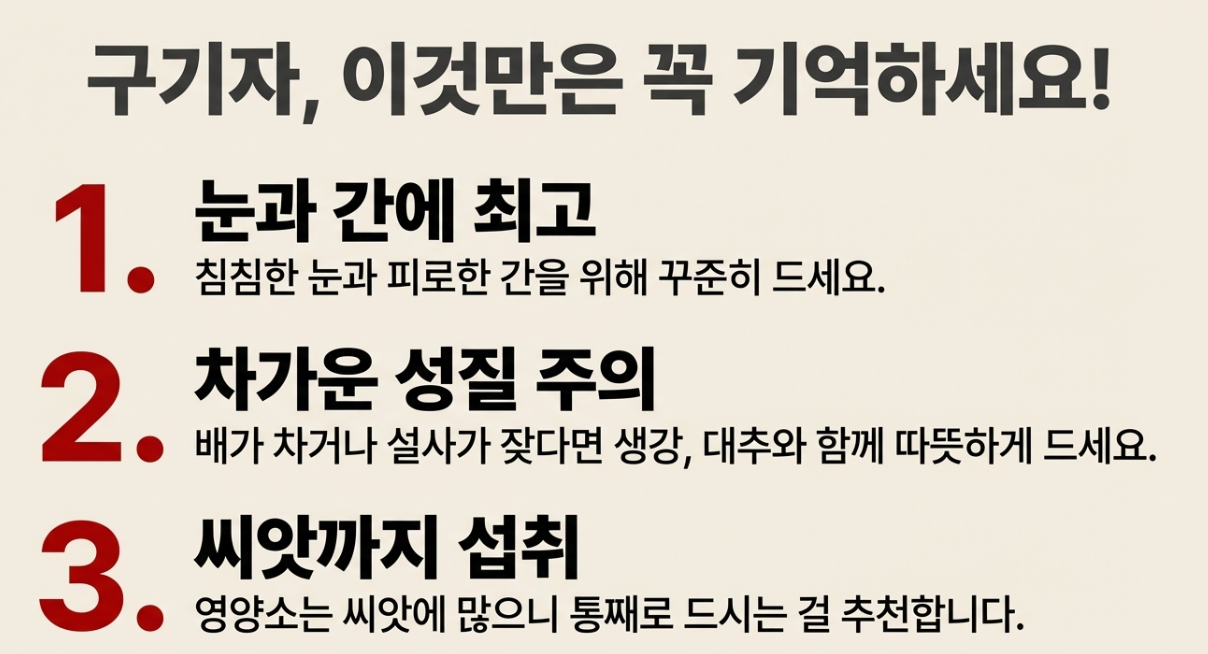 - 눈과 간에 최고: 침침한 눈과 피로한 간을 위해 꾸준히 드시면 좋아요.