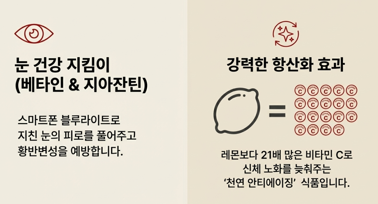 - 강력한 항산화 효과 (노화 방지): 비타민C가 레몬보다 무려 21배나 많다는 사실, 알고 계셨나요? 활성산소를 제거해 피부 탄력을 유지하고 신체 노화를 늦춰주는 '천연 안티에이징' 식품이에요.