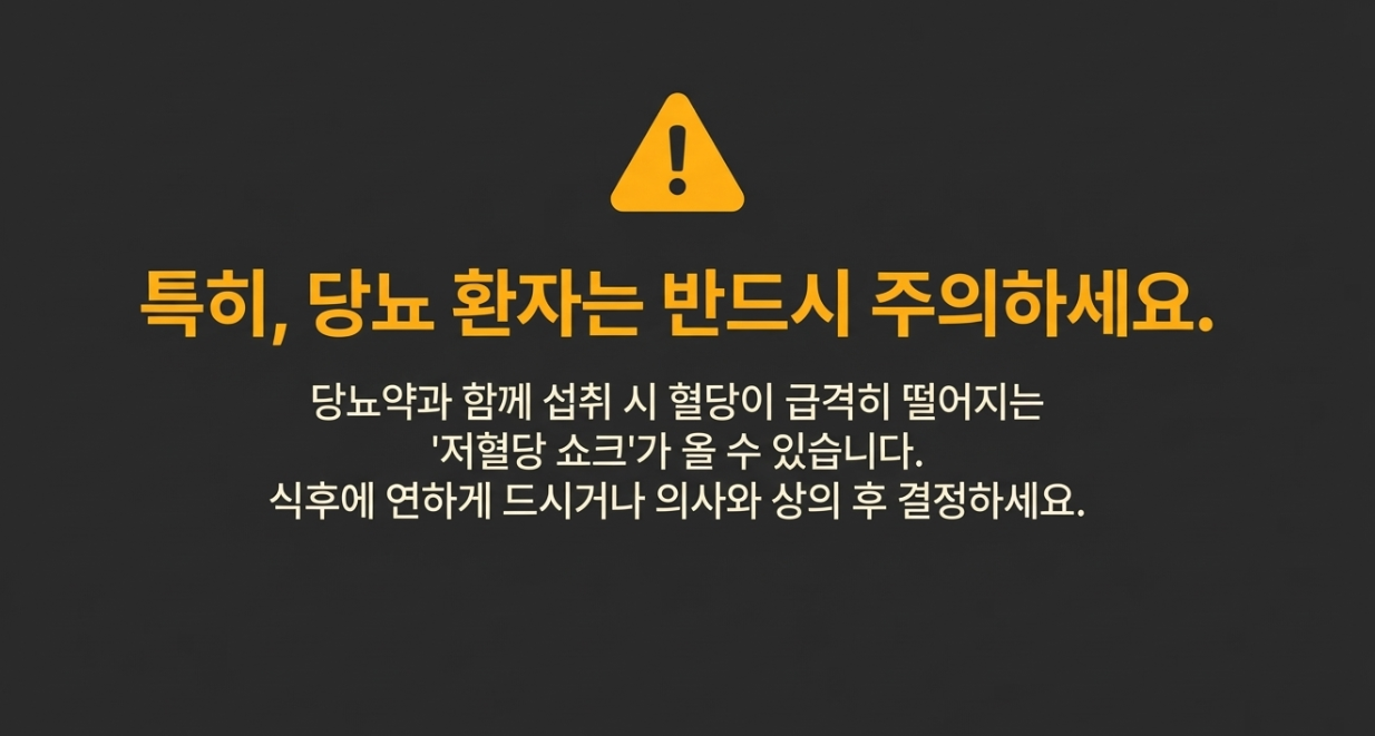 당뇨약을 드시고 계신다면 혈당이 너무 급격하게 떨어지는 저혈당 쇼크가 올 수도 있어요. 당뇨 환자분들은 식후에 연하게 드시거나 의사와 상의 후 드시는 게 안전해요.
