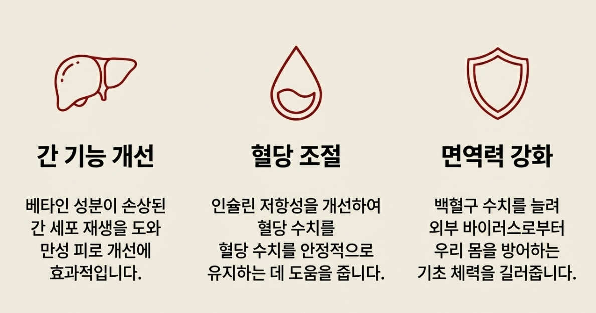 - 간 기능 개선 및 피로 회복: 베타인 성분이 간에 지방이 쌓이는 것을 막아주고, 손상된 간 세포 재생을 도와 숙취 해소와 만성 피로 타파에 효과적이에요.