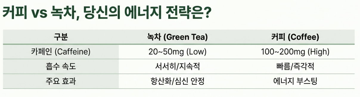 | 구분 | 녹차 (Green Tea) 🍵 | 커피 (Coffee) ☕ |