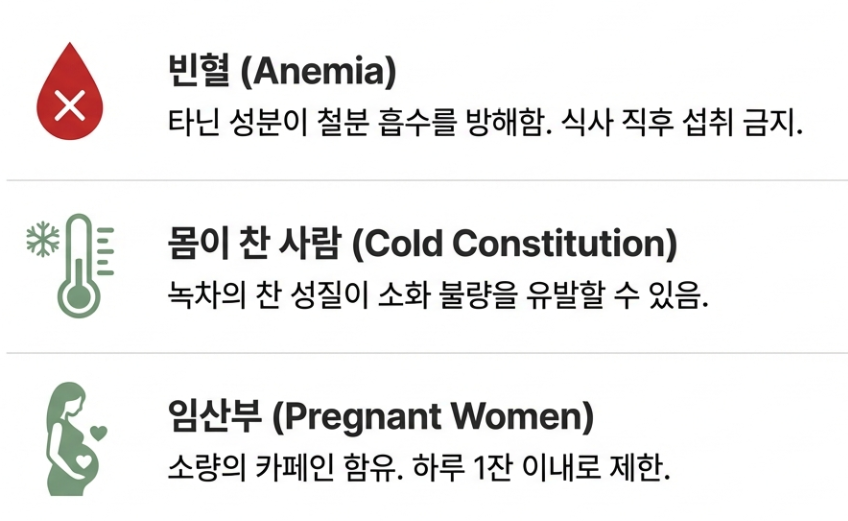 - 빈혈이 있는 분: 녹차의 타닌 성분이 음식물의 철분 흡수를 방해해요. 식사 직후 바로 진한 녹차를 마시는 건 피하는 게 상책입니다. (최소 30분 뒤에 드세요!)