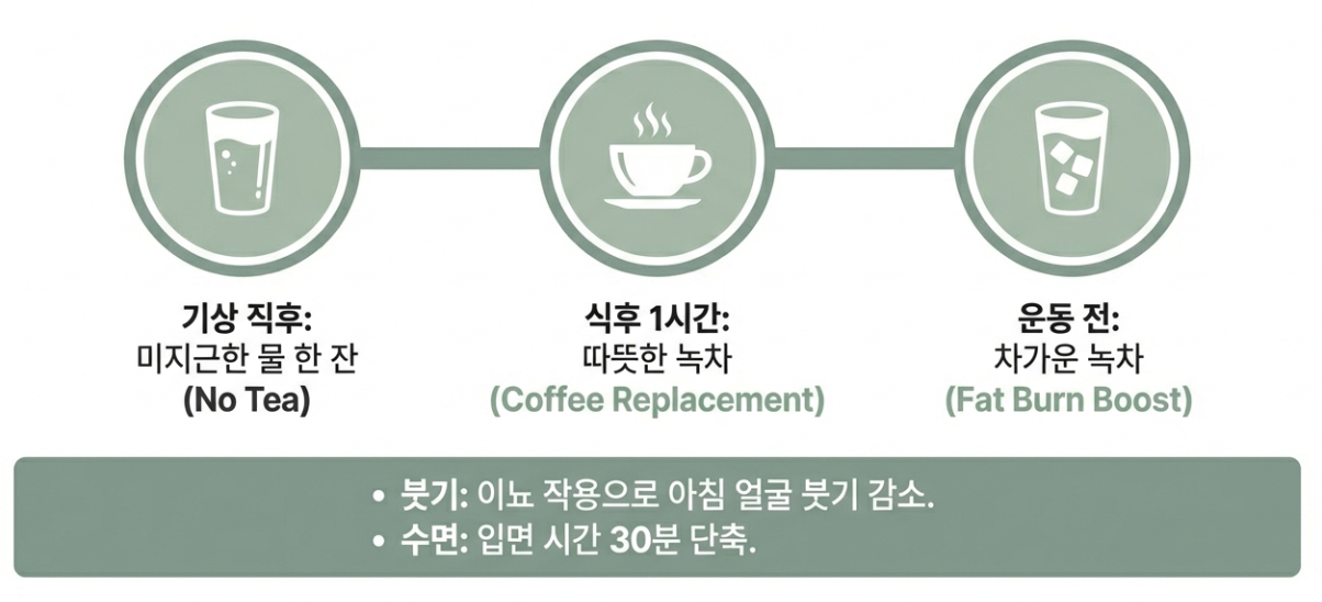 아침 빈속에 녹차를 마시면 위 점막을 자극해 속 쓰림을 유발할 수 있어요. 꼭 가벼운 식사 후에 따뜻하게 드세요.