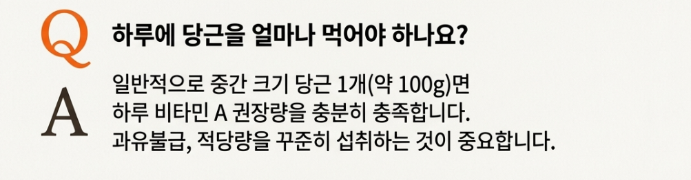 A2: 일반적으로 중간 크기의 당근 1개(약 100g) 정도면 하루 권장 비타민 A 섭취량을 충분히 충족시킵니다. 과도하게 많이 먹으면 카로틴혈증이 생길 수 있으니, 적당량을 꾸준히 섭취하는 것이 중요합니다.