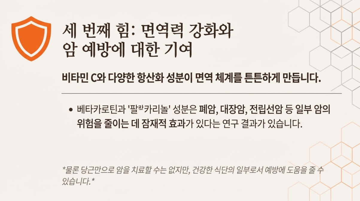 당근에는 비타민 C와 다양한 항산화 물질이 포함되어 있어 면역 체계를 강화하는 데 도움을 줍니다. 또한, 베타카로틴과 팔카리놀 같은 성분들은 특정 암, 특히 폐암, 대장암, 전립선암 등의 위험을 줄이는 데 잠재적인 효과가 있다는 연구 결과들이 보고되고 있습니다. 물론 당근 하나만으로 암을 치료할 수는 없지만, 건강한 식단의 일부로서 예방에 도움을 줄 수 있습니다.