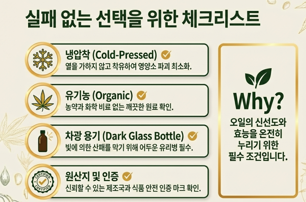 - ✅ 냉압착 유기농 제품을 선택하고, 빛을 피해 보관하는 것이 중요합니다.