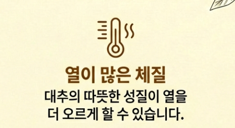 - 몸에 열이 많은 체질: 대추는 따뜻한 성질이라 열을 더 오르게 할 수 있어요.