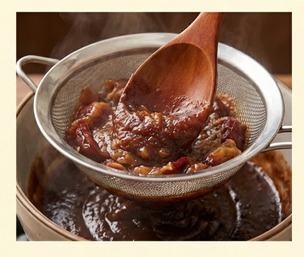 - 으깨기 (핵심!): 대추가 흐물흐물해지면 체에 밭쳐 으깨주세요. 껍질과 씨만 남기고 과육을 전부 국물로 내려야 걸쭉하고 진한 맛이 납니다.