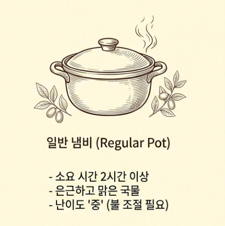 | 구분 | 일반 냄비 🍲 | 압력밥솥 (추천!) 🍚 |