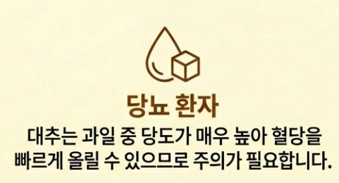 몸에 좋은 대추차지만, 모두에게 좋은 건 아니에요. 특히 당뇨가 있으신 분들은 주의하셔야 해요. 대추는 과일 중에서도 당도가 매우 높은 편이라 혈당을 빠르게 올릴 수 있거든요.