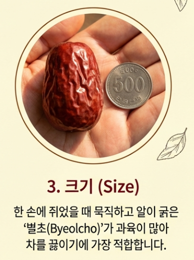 - 크기: 한 손에 쥐었을 때 묵직하고 알이 굵은 것(별초)이 과육이 많아 차 끓이기에 좋습니다.