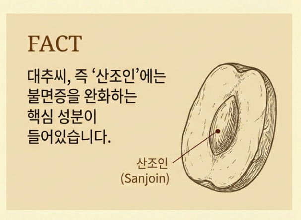 오히려 대추씨(산조인)에는 불면증을 완화하는 핵심 성분이 들어있어요. 독성이 없으니 안심하고 통째로 푹 끓인 뒤, 나중에 걸러내는 것이 훨씬 좋습니다.