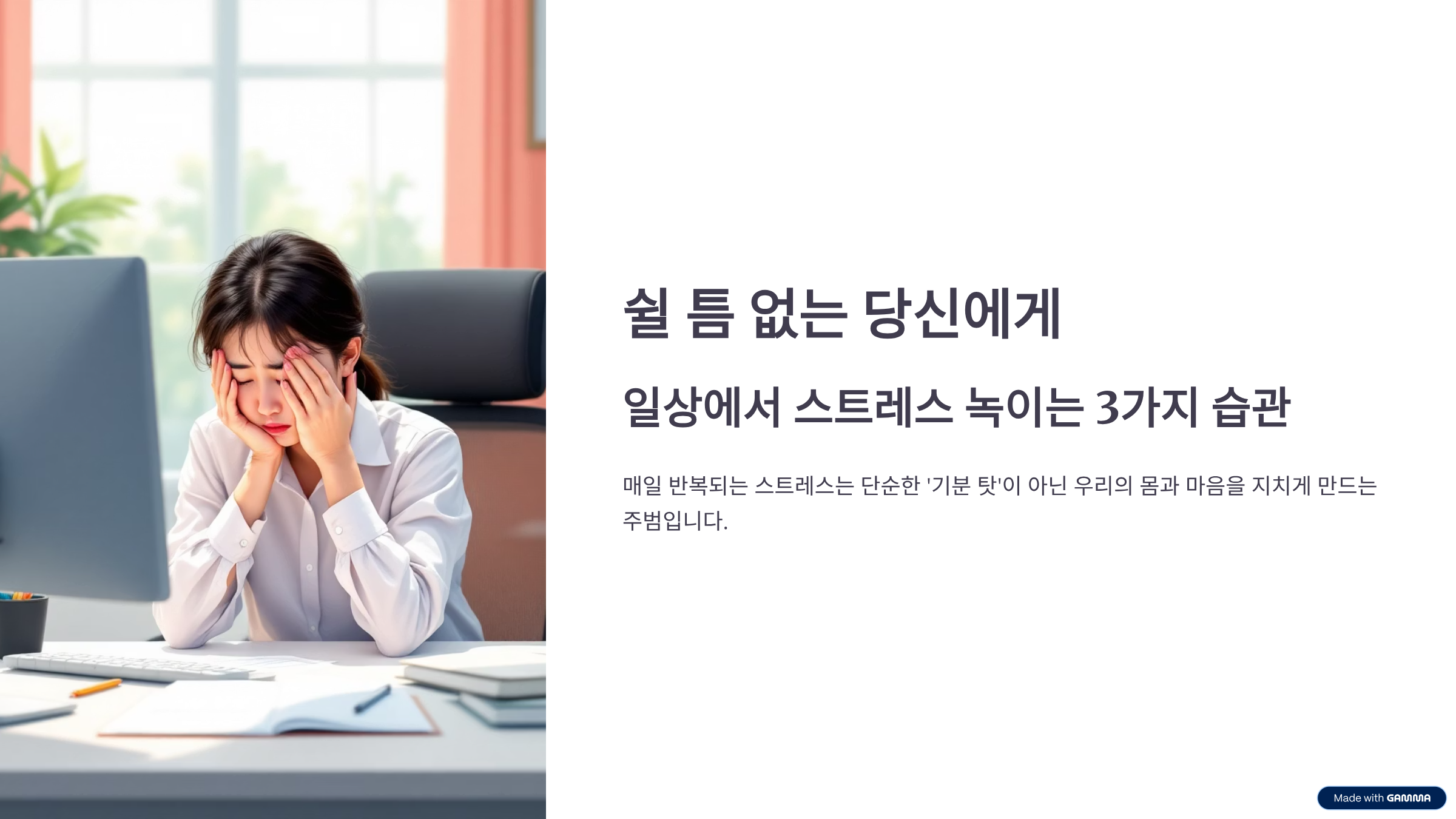 오늘도 모니터 앞에서 한숨부터 쉬셨나요? 아침에 눈 뜨자마자 쌓여있는 업무 메시지에, 종일 울리는 전화벨과 이어지는 회의까지. 30대 직장인이라면 누구나 공감할 만한 풍경입니다. ‘오늘 하루도 무사히 버텨낼 수 있을까?’하는 막막함과 끝없는 압박감에 어깨는 천근만근 무거워지고, 머릿속은 복잡하게 얽혀있죠. 이처럼 매일 반복되는 스트레스는 단순히 ‘기분 탓’이 아니라, 우리의 몸과 마음을 서서히 지치게 만드는 주범입니다.