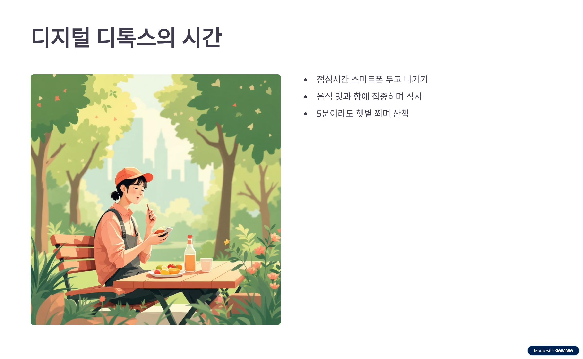 우리의 뇌는 끊임없는 스마트폰 알림과 정보의 홍수 속에서 제대로 쉬지 못하고 있습니다. 특히 점심시간마저 스마트폰을 보며 밥을 먹는 습관은 뇌를 더욱 지치게 만듭니다. 의식적으로 ‘디지털 디톡스’ 시간을 갖는 것이 중요합니다.