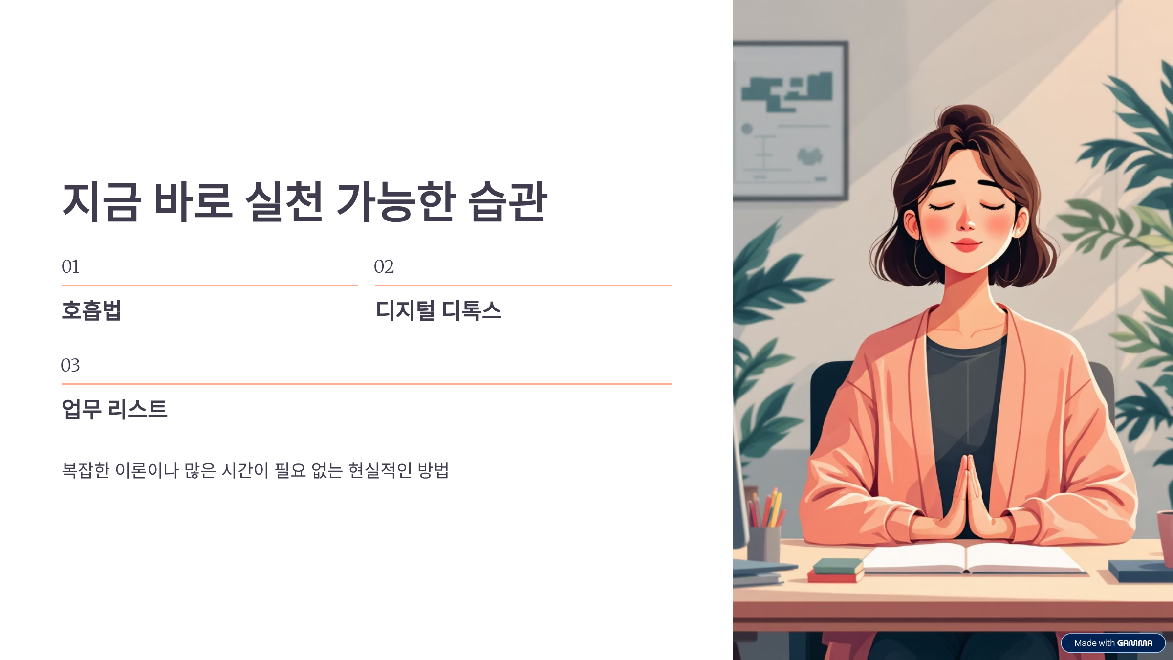 - 팁: 중요한 프레젠테이션 전이나, 상사에게 보고하기 직전, 혹은 갑자기 화가 치밀어 오를 때 딱 3번만 반복해보세요. 주변 상황에 휩쓸리지 않고 차분하게 대처하는 자신을 발견하게 될 겁니다.