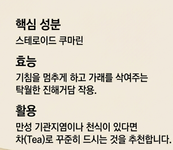 미세먼지가 심한 요즘 딱입니다. 스테로이드 쿠마린 성분이 기침을 멈추게 하고 가래를 삭여줍니다. 만성 기관지염이나 천식이 있다면 차로 꾸준히 드시는 걸 추천해요.