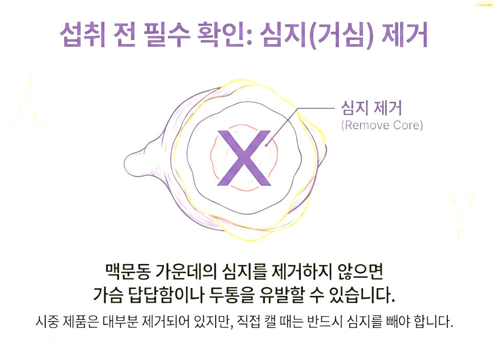 1. 심지 제거(거심) 확인: 맥문동 가운데에는 심지가 있는데, 이걸 제거하지 않으면 가슴이 답답하거나 두통을 유발할 수 있어요. 시중 제품은 대부분 제거되어 나오지만, 직접 캐신다면 반드시 심지를 빼야 합니다.