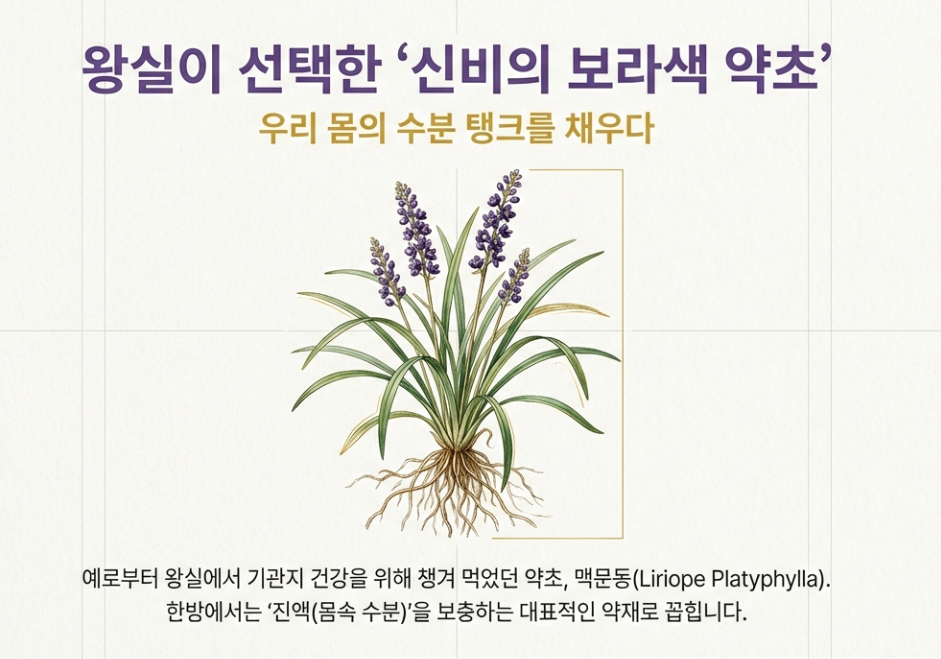 맥문동(Liriope Platyphylla)은 한방에서 '진액을 보충하는 약재'로 아주 유명해요. 쉽게 말해 우리 몸속의 수분 탱크를 채워주는 역할을 한다고 보시면 돼요.