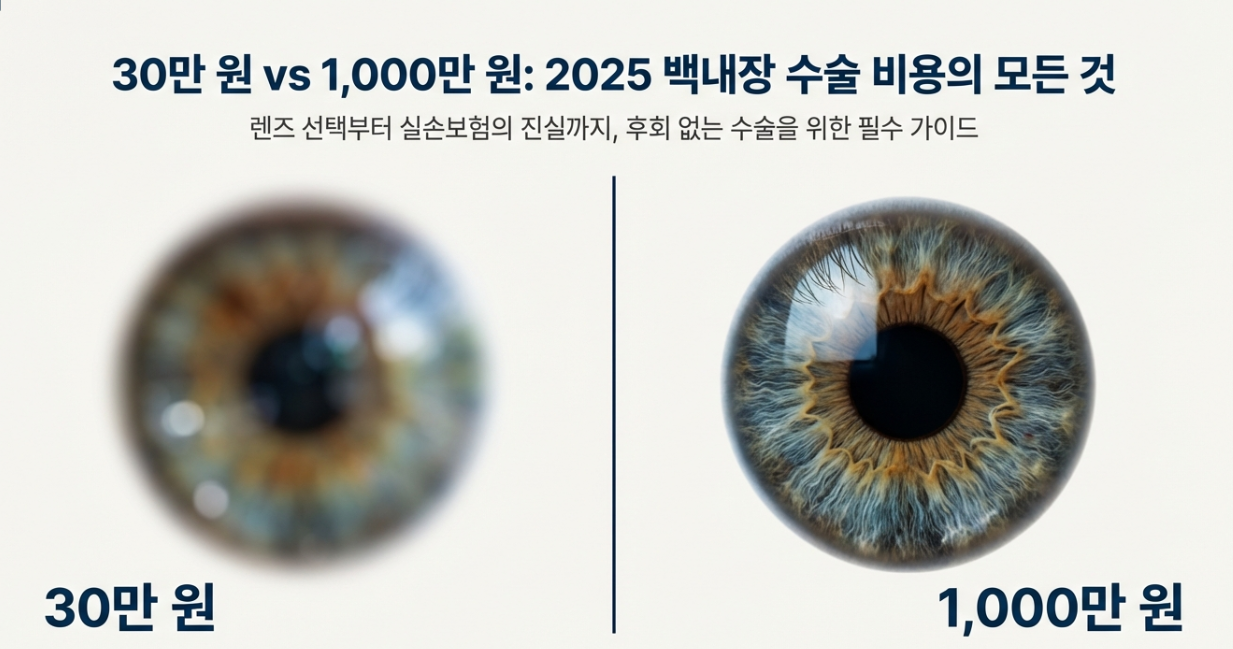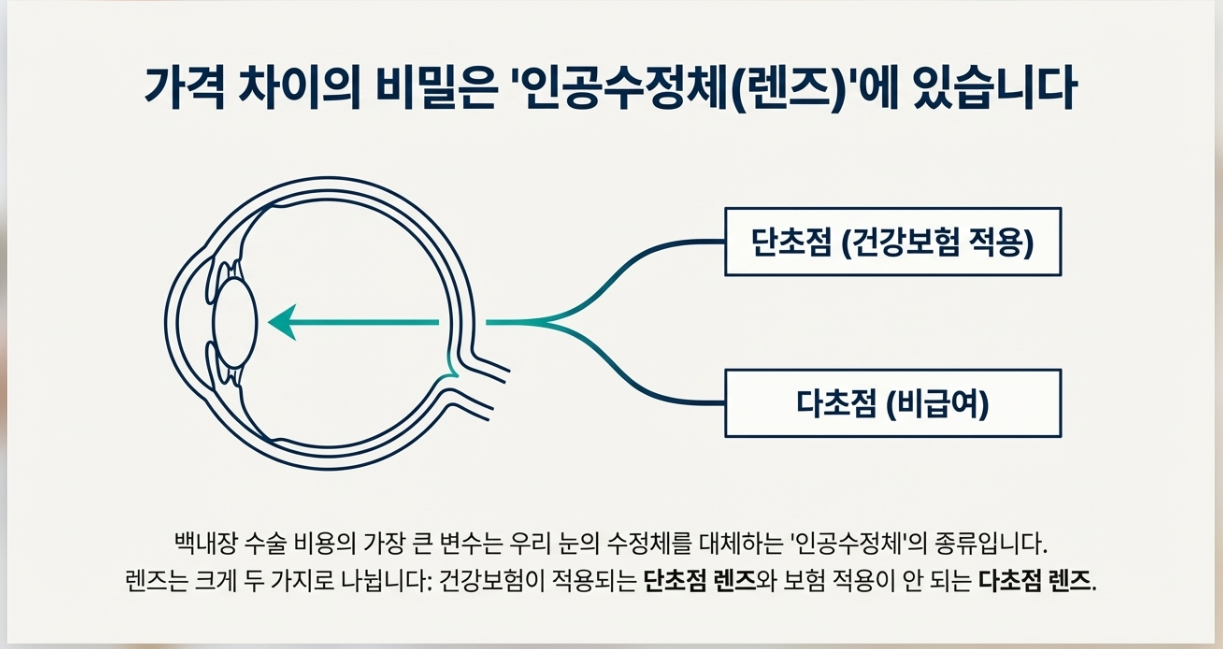 백내장 수술 비용을 검색해 보면 "어디는 30만 원이다", "어디는 1,000만 원이 넘는다"라며 정보가 뒤죽박죽이라 혼란스러우셨죠? 결론부터 말씀드리면 두 말 다 맞습니다. 가장 큰 이유는 바로 '어떤 렌즈(인공수정체)를 쓰느냐'에 달려 있어요.