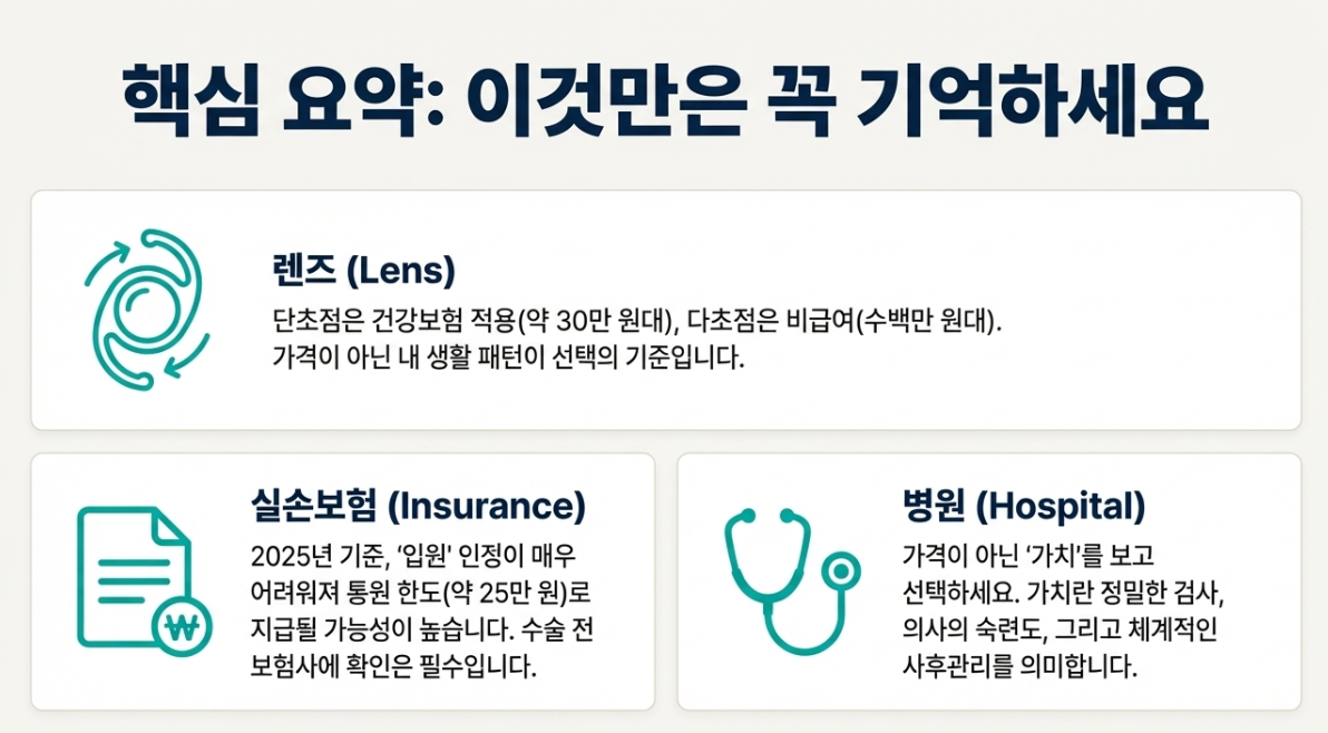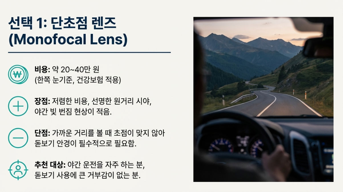 '최신 렌즈가 무조건 좋다'며 비싼 다초점 렌즈를 권하는 병원도 있습니다. 하지만 야간 운전을 많이 하시거나 예민하신 분들은 빛 번짐 부작용 때문에 오히려 단초점 렌즈가 더 적합할 수 있어요. 꼭 라이프스타일에 맞춰 상담받으세요!