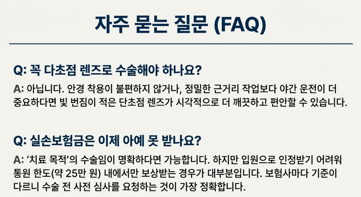 → 즉, "단순 노안 교정 목적"으로 다초점 렌즈 수술을 하면 보험금을 한 푼도 못 받을 수도 있습니다.