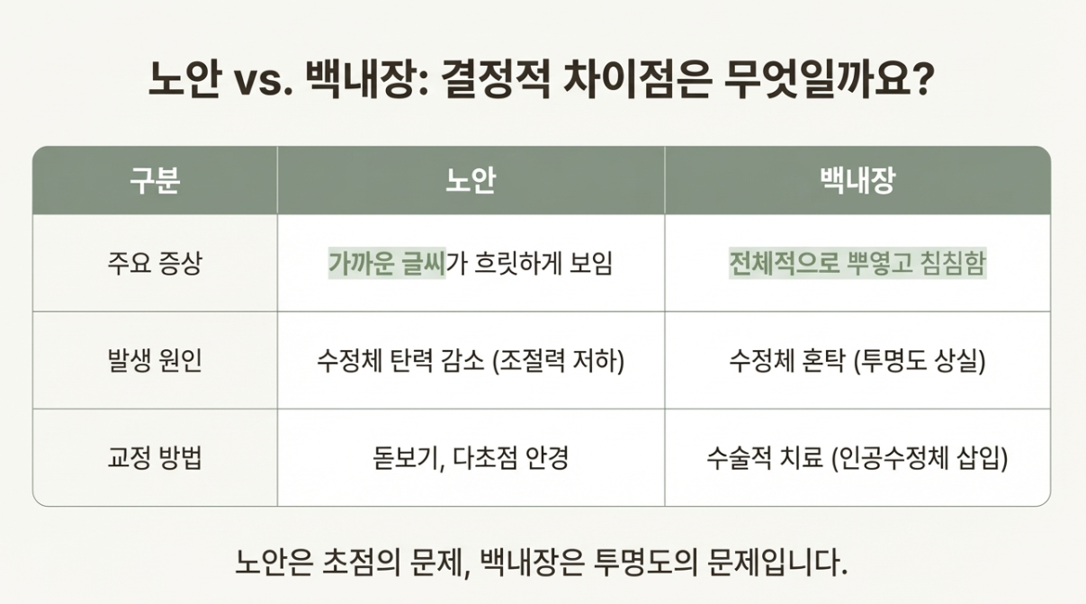 | 발생 원인 | 수정체 탄력 감소 (조절력 저하) | 수정체 혼탁 (투명도 상실) |