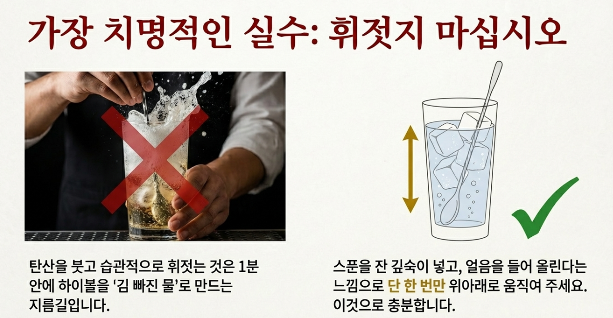 - 잔 칠링(Chilling): 하이볼 잔에 얼음을 가득 채우고 머들러로 휘저어 잔을 차갑게 식혀주세요. 녹은 물은 반드시 따라 버립니다.