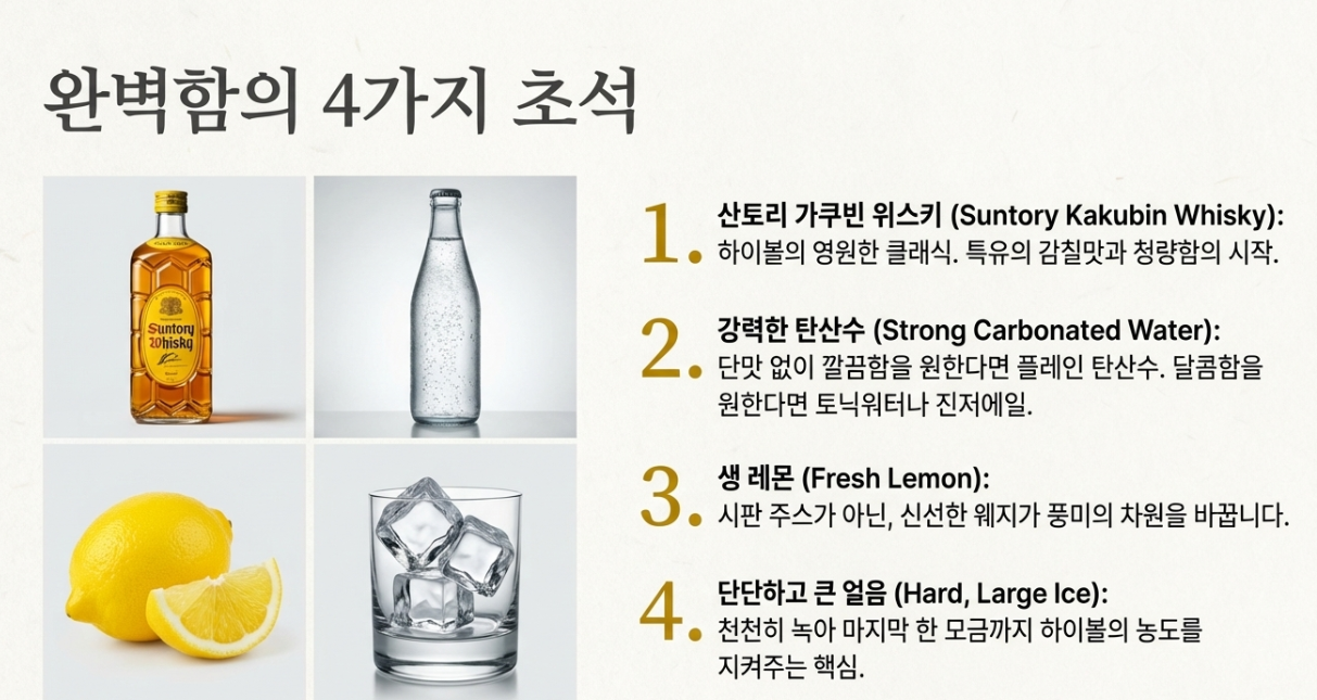"장비발"이라는 말이 있듯이, 하이볼도 재료 준비가 맛의 8할을 결정해요. 복잡할 것 없이 딱 4가지만 기억하세요.