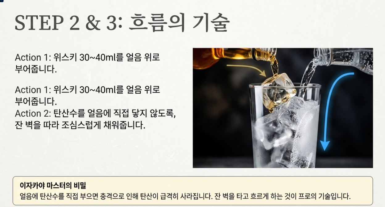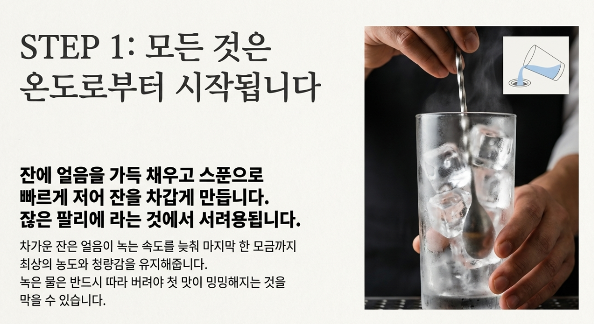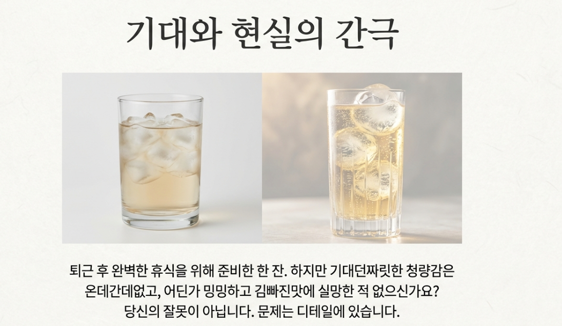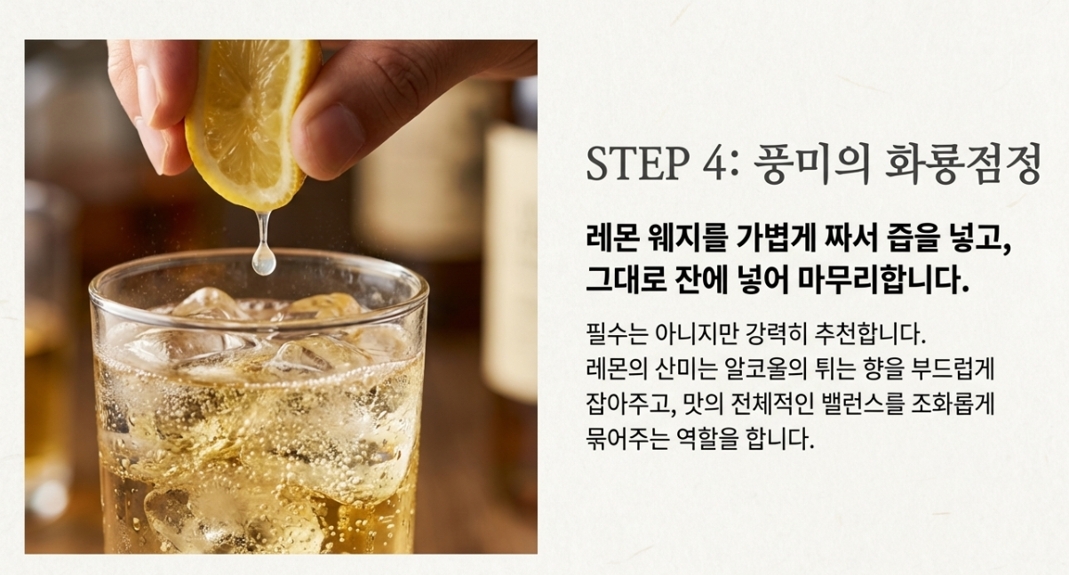 - 밸런스 (Balance): 위스키 향만 너무 강하거나, 반대로 맹물 맛이 나진 않나요? 1:3 비율에서 조금씩 가감하며 나만의 비율을 찾아보세요.