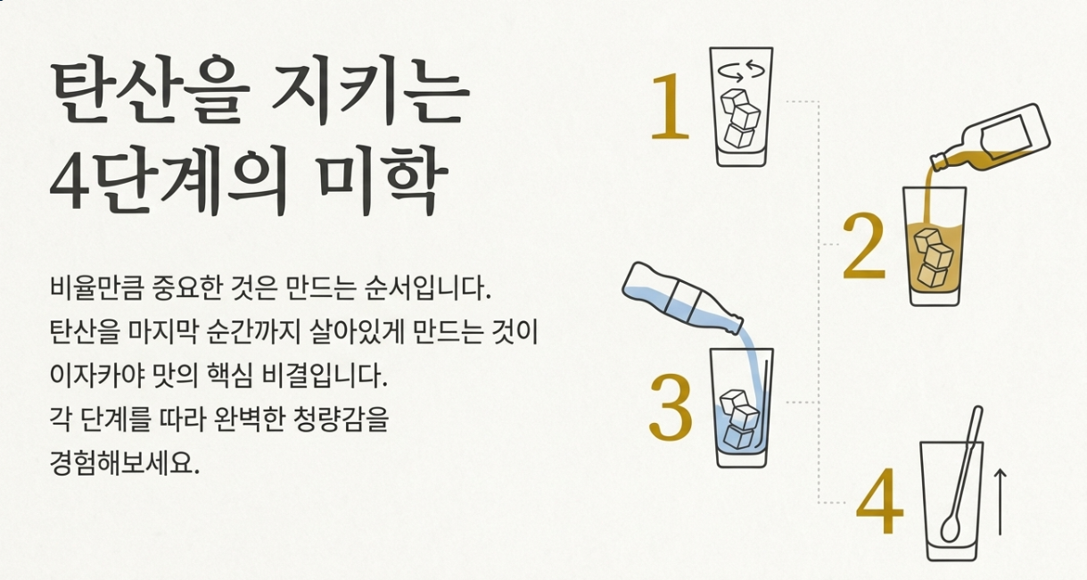 비율만큼 중요한 것이 바로 '만드는 순서'예요. 탄산을 꽉 잡는 것이 핵심입니다!