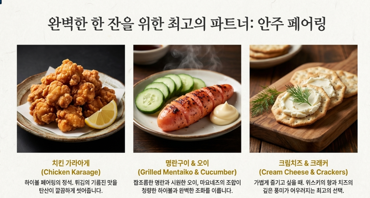 - 치킨 가라아게 (튀김류): 하이볼의 정석 안주! 기름진 맛을 탄산이 싹 씻어줘서 무한 흡입 가능해요.