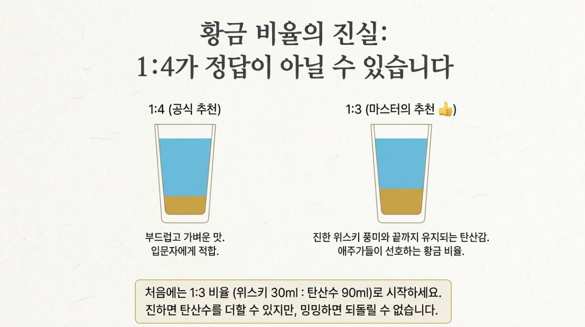 처음에는 1:3 비율 (위스키 30ml : 탄산수 90~100ml)로 시작해보세요. 마시다가 너무 독하면 탄산수를 더 넣으면 되지만, 처음부터 밍밍하면 되살리기 어렵답니다!