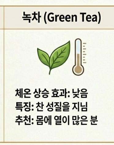 | 녹차 | 낮음 | - (찬 성질) | 몸에 열이 많은 분 |