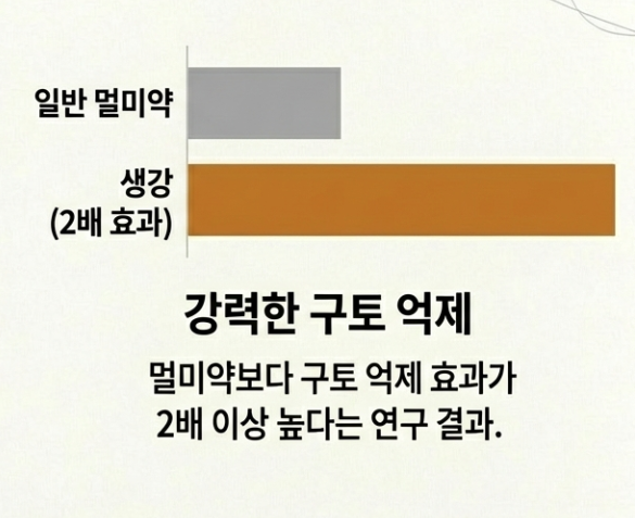 게다가 멀미약 대신 생강을 쓴다는 이야기 들어보셨나요? 연구에 따르면 생강이 멀미약보다 구토 억제 효과가 2배 이상 높다고 해요. 입덧 심한 임산부들에게도 연하게 탄 생강차를 권하는 이유가 바로 이거랍니다.