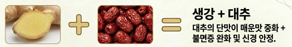 - 생강 + 대추: 불면증 완화와 신경 안정에 최고예요. 대추의 단맛이 생강의 매운맛을 중화시켜 줍니다.