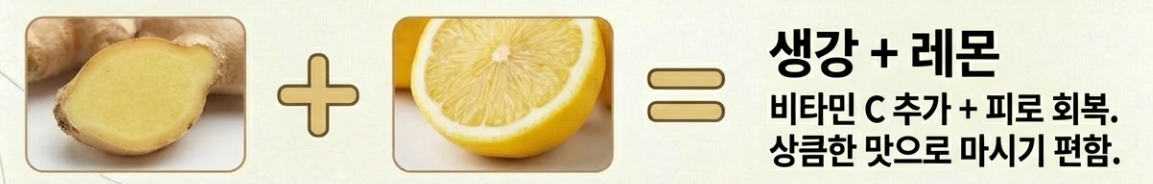 - 생강 + 레몬: 비타민 C가 더해져 감기 예방과 피로 회복에 탁월합니다. 맛도 훨씬 상큼해요! 🍋
