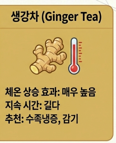 | 생강차 | 매우 높음 | 길다 (속부터 데움) | 수족냉증, 감기 기운 |