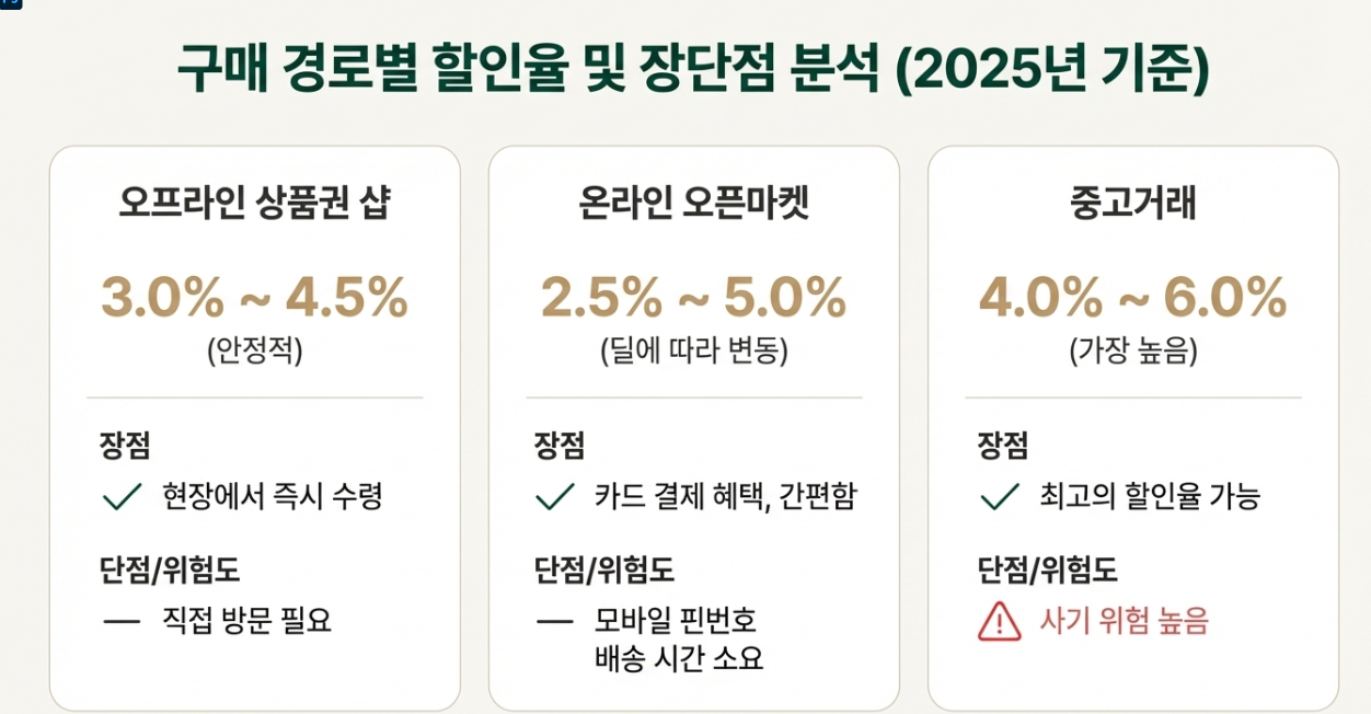 | 오프라인 상품권 샵 (구두방) | 3.0% ~ 4.5% | 현장에서 바로 종이 상품권 수령 가능 |