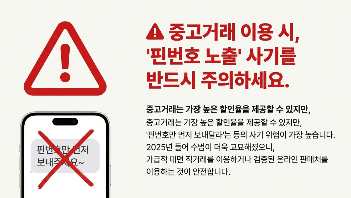 중고거래 시 '핀번호 노출' 사기를 조심해야 합니다. 2025년 들어 교묘한 사기 수법이 많아졌으니, 가급적이면 오프라인 대면 거래를 하거나 검증된 온라인 판매처를 이용하세요.