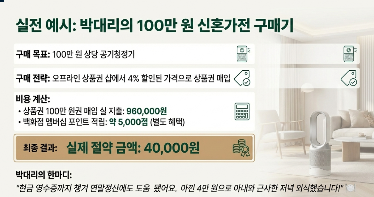 - 구매 전략: 인근 상품권 샵에서 4% 할인 가격에 매입