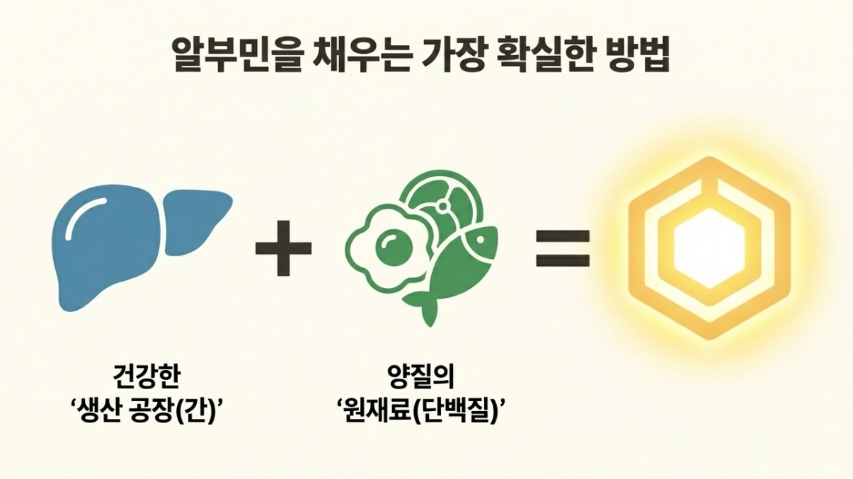 알부민은 100% 간에서 만들어집니다. 아무리 좋은 단백질을 먹어도 공장(간)이 과로 중이라면 생산이 안 되겠죠? 금주와 충분한 수면은 필수입니다.