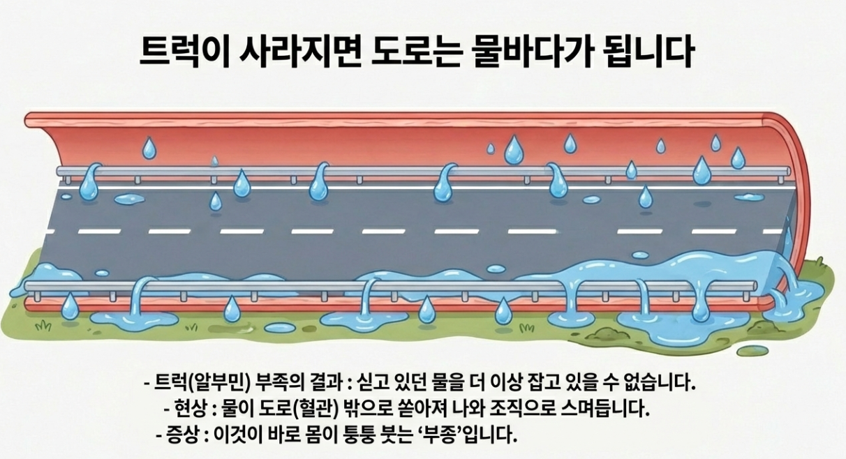 트럭(알부민)이 부족해지면 어떻게 될까요? 짐을 배달 못 하니 몸에 힘이 없고, 싣고 있던 물이 도로 밖으로 쏟아져 나와 몸이 퉁퉁 붓게 되는 거죠. (이게 바로 부종이에요!)