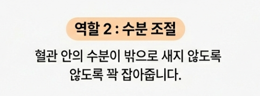- 수분 조절(삼투압): 혈관 안의 수분이 밖으로 새 나가지 않도록 꽉 잡아주는 역할을 해요.