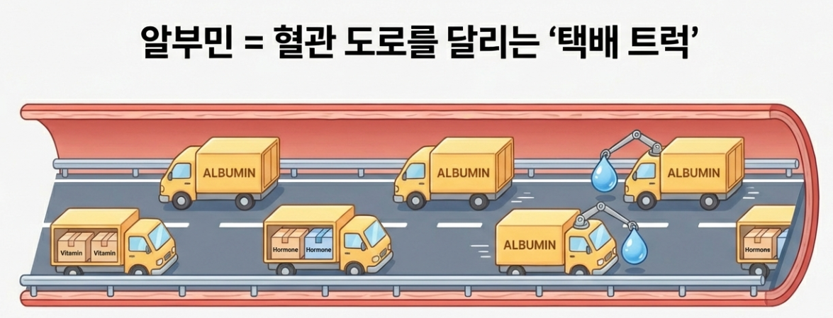 어려운 의학 용어 대신 상상을 한번 해볼까요? 알부민은 혈관이라는 도로를 달리는 '택배 트럭'과 같아요.
