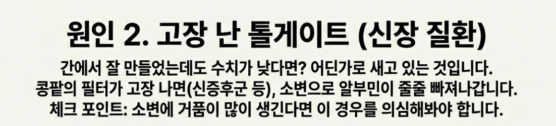 간에서 잘 만들었는데도 수치가 낮다면? 어딘가로 새고 있는 거예요. 콩팥의 필터가 고장 나면(신증후군 등), 소변으로 알부민이 줄줄 빠져나갑니다. 소변에 거품이 많이 생긴다면 이 경우를 의심해봐야 해요.