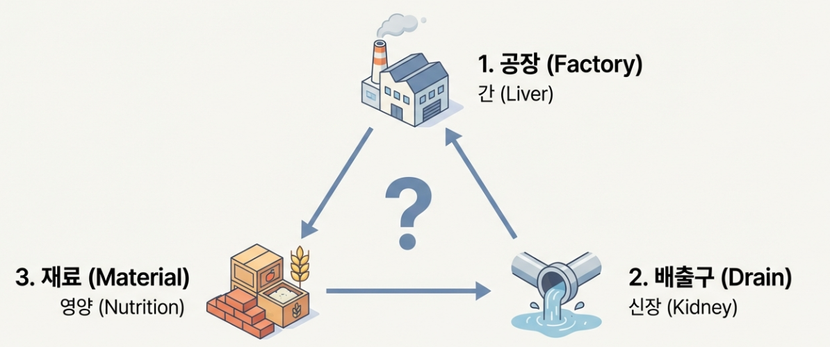 알부민은 100% 간에서 만들어집니다. 만약 간염, 간경화, 혹은 잦은 음주로 간 기능이 떨어졌다면? 공장이 파업한 상태라 알부민을 생산하지 못해요. 가장 흔하고 주의 깊게 봐야 할 원인입니다.