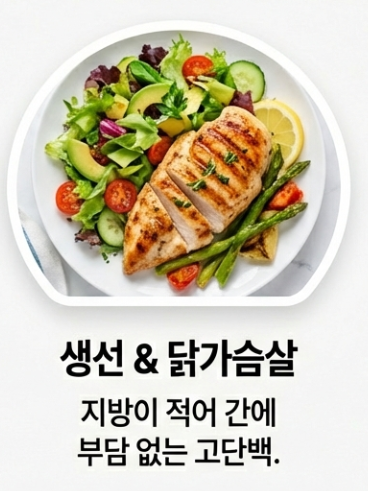 - 생선 & 닭가슴살: 지방이 적고 단백질이 풍부해 간에 부담을 덜 줍니다.