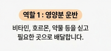 - 영양분 운반: 각종 비타민, 호르몬, 약물 등을 싣고 필요한 곳으로 배달해요.